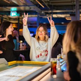 Such a fun and engaging place for groups of all sizes! The drinks and food are great, and the shuffle games make this place even better. The service here is also fantastic; our servers were incredibly attentive! Drinks and food were brought out in a timely manner, and the bartenders also make drinks pretty quickly. There's so much room on both floors to hang out, and the entire facility is kept clean. Parking is the only downside, as street parking and the nearby lots can be pricey. The dart station is not too far though